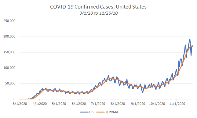 Now that this county-level data is available via the CDC, I was able to pull the data down from John Hopkins and conduct similar analyses as my previous Florida post. Population data is from Census estimates as of 2019. Note that I am using raw case counts, and not estimating true infections like Youyang Gu does. With 3,143 county equivalents in the U.S., the conclusions should track closely for both raw case counts and true infection estimates. Data through 11/25 as to not be skewed by day-to-day Thanksgiving variance.